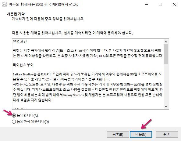 라이선스 계약을 읽고 “동의합니다(I Accept)”를 클릭하여 약관에 동의하세요. 계속하려면 “다음(Next)”을 클릭합니다.