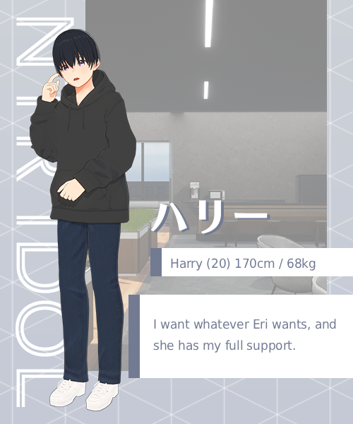 In this game, the player becomes the manager of Eri, a university student who has the potential to become an incredible idol. She is invited to the agency for special training, during which she will learn about the unspoken rules of the industry, and Harry, her boyfriend, will witness her transformation from an innocent girl to a veteran idol.