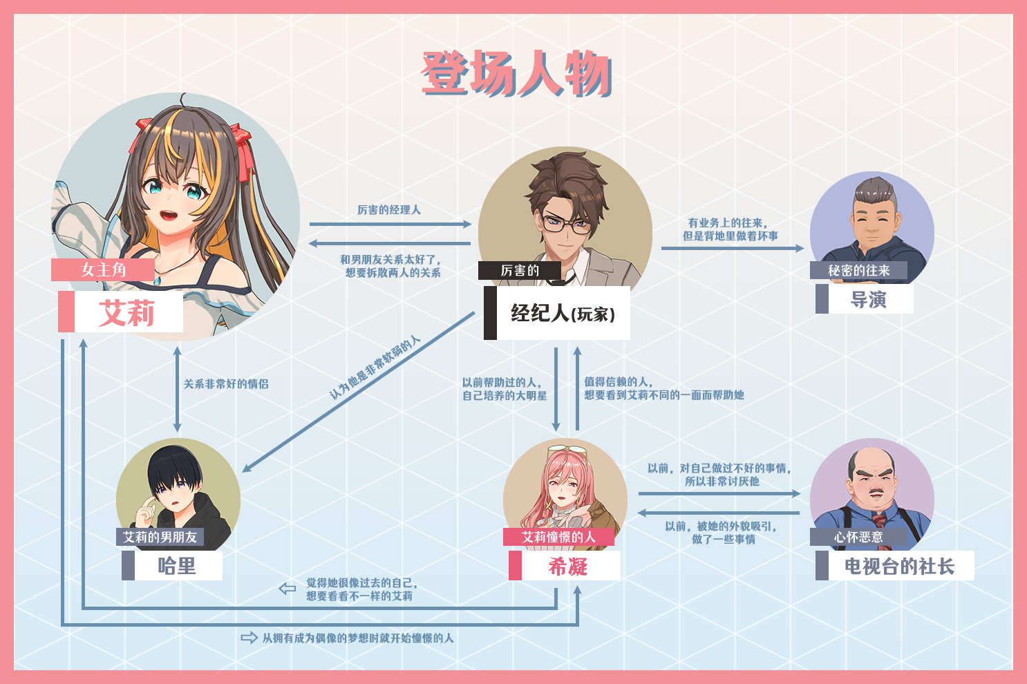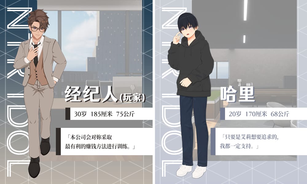 故事 玩家將扮演經紀人,前往大學發掘有潛力成為偶像的新人「艾莉」,邀請她加入事務所進行「特殊培養」,以及偶像事業的「潛規則」。 並讓艾莉的男友「哈里」看著她從「清純的少女」逐步成為「資深偶像」的過程。以及還有意想不到的偶像結局等著玩家探索!